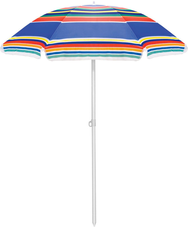 This umbrella is perfect for the beach, camping, or picnics. The pole measures 79.5'' tall and 1.25'' diameter with a tilting option as well as pointed end for easier penetration into the ground. Umbrella measures 57.5'' across. Sturdy carry bag with handle included.