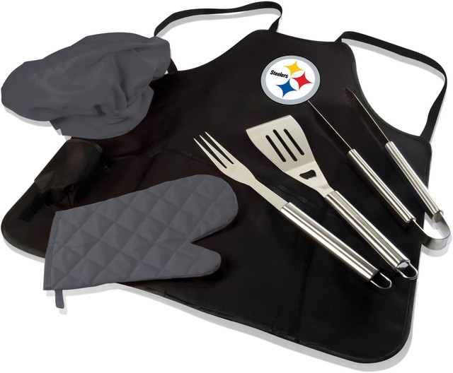 The Pittsburgh Steelers BBQ Apron Tote Pro features a tote that converts to a full-sized apron with adjustable straps and deluxe barbecue tool set. Set includes a large spatula with bottle opener, a large fork, and tongs. Measures 19'' x 18'' x 2'' and weighs 5 lbs.