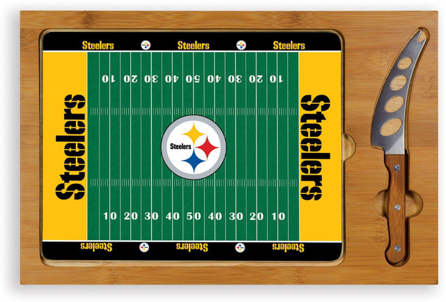 The Icon Pittsburgh Steelers Cutting Board is a 3-pc. set that has a solid rubberwood base with a bamboo rim accent, a tempered glass lid, & a cheese knife with its own carved out area in the wood base. Measures 15.2''L x 10''W x .8''H.