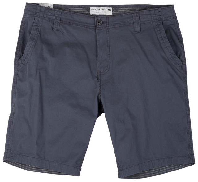 Projek Raw shorts feature a classic solid color design, two front and back pockets, and comfortable twill fabrication. Fabrication is 97% cotton, 3% spandex. Inseam measures approximately 9 inches. Outseam measures approximately 18 inches.