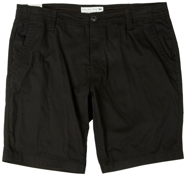 Projek Raw shorts feature a classic solid color design, two front and back pockets, and comfortable twill fabrication. Fabrication is 97% cotton, 3% spandex. Inseam measures approximately 9 inches. Outseam measures approximately 18 inches.