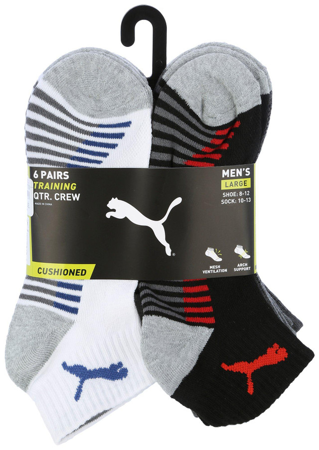 These mens quarter crew socks feature a print pattern with a Puma logo on a poly blend fabrication, sport cushion, mesh ventilation, and arch support. Contains six pairs of socks. Fits shoe size 8-12, sock size 10-13. Fabrication 96% polyester, 3% rubber, 1% spandex.