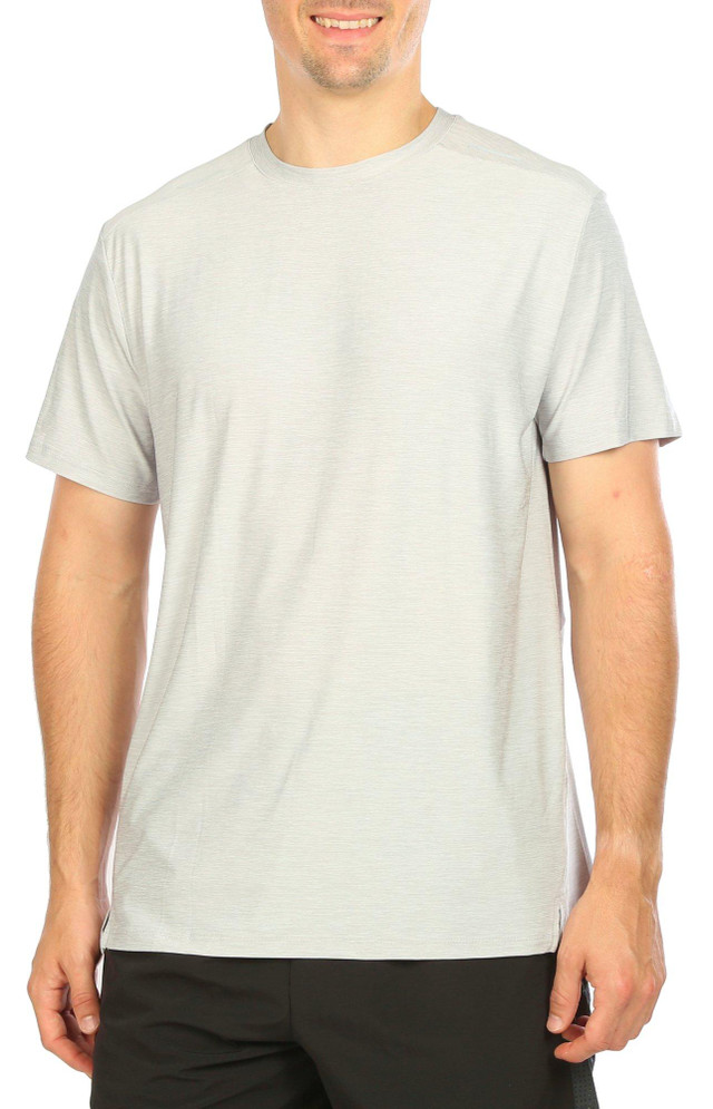 This durable t-shirt from RB3 Active will help keep you cool and comfortable all day! This short sleeve top features stretch technology, reflectors styling designs at back and front, a crew neckline, and relaxed fit. Fabrication is 93% polyester, 7% spandex. Length measures approximately 29 inches.