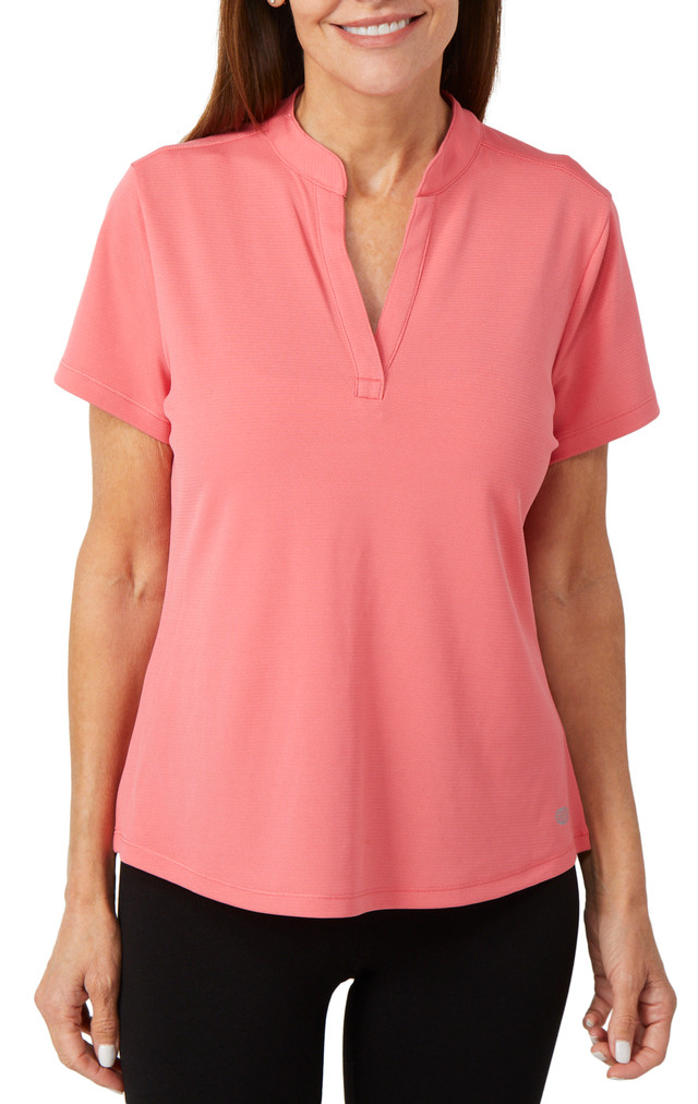Reel Legends Freeline styles provide moisture management technology, quick dry properties, and UPF 30 sun protection. This short sleeve top features a solid color design on lightweight textured knit fabric, a v-neckline, mandarin collar, hi-low hemline, and comfortable fit. The top length measures approximately 28 in. Fabrication 100% polyester.
