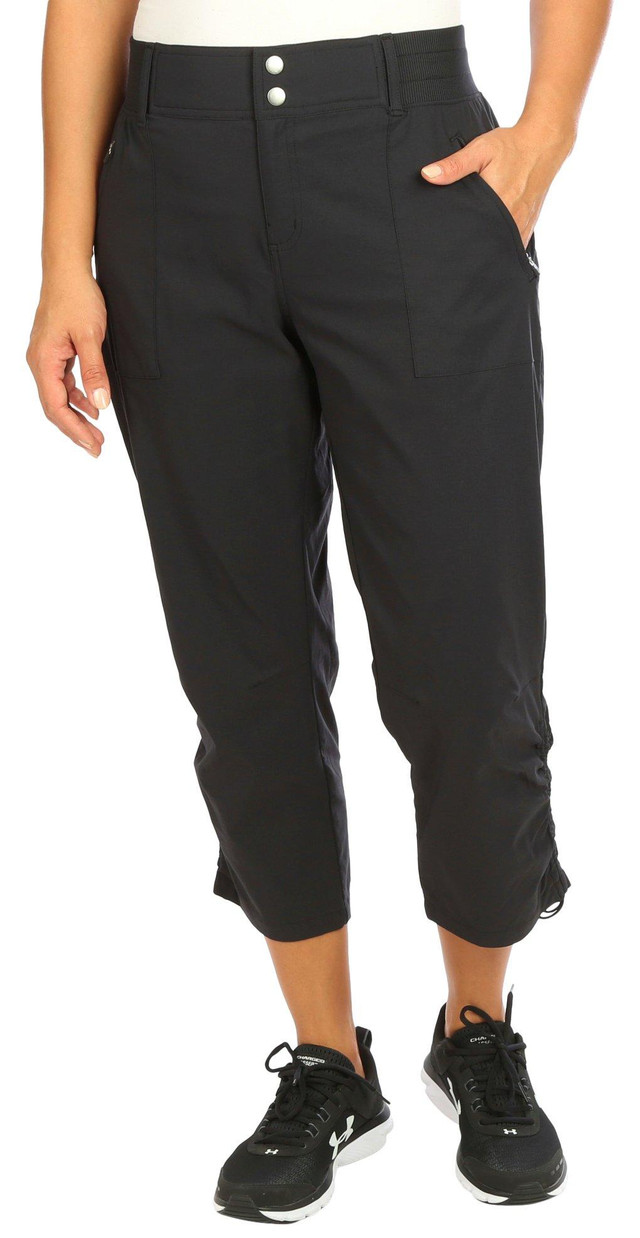 Reel Legends apparel is perfect for any land or sea adventure! These pants feature a solid color design on lightweight stretch woven fabric, an elastic waistband with front double snap button closure, two front pockets, two back pockets, ruched ankles, moisture-wicking and quick-dry technology, UPF 50 sun protection, and pull-on styling. The inseam measures approximately 24 in. Fabrication 95% polyester, 5% spandex.