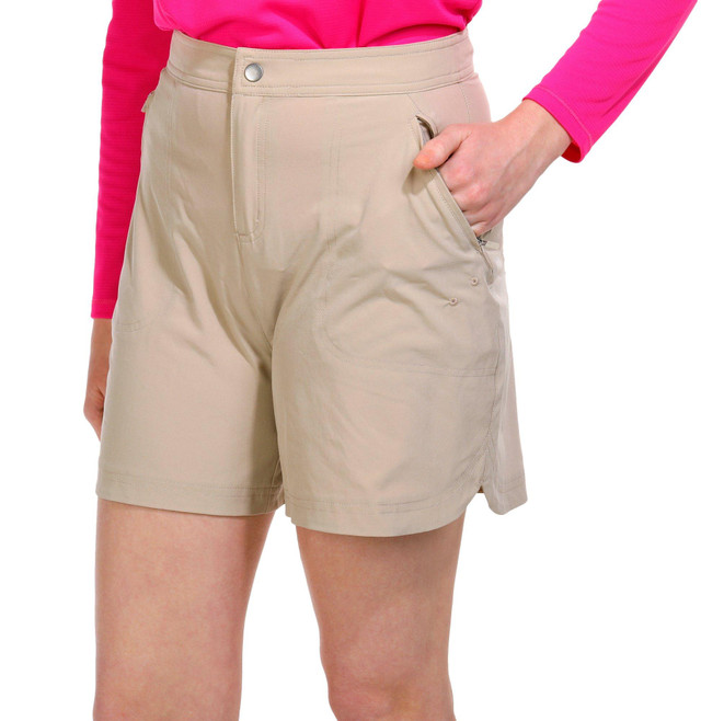 The Women's 5 in. Solid Woven Estuary Shorts are designed for comfort and functionality. Made from lightweight woven fabric (86% polyester, 14% spandex), they feature a single button and zipper closure, two front pockets, and two back Velcro pockets. With UPF 50+ sun protection, the 5-inch inseam provides a breathable, flexible fit. Unlined for added comfort, these shorts are perfect for outdoor activities and casual wear.