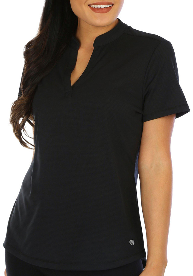 Reel Legends offers performance designs to support the active lifestyle. This short sleeve top features a solid color design on lightweight freeline fabric like line running through, a v-neckline with mandarin collar, hi-low curved back hemline, solid color for effortless matching, and comfortable fit. The top length measures approximately 25 in front hemline. Fabrication 100% polyester.
