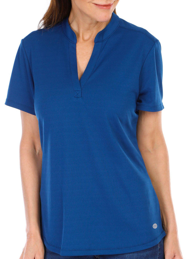 Reel Legends offers performance designs to support the active lifestyle. This short sleeve top features a solid color design on lightweight freeline fabric like line running through, a v-neckline with mandarin collar, hi-low curved back hemline, solid color for effortless matching, and comfortable fit. The top length measures approximately 25 in front hemline. Fabrication 100% polyester.
