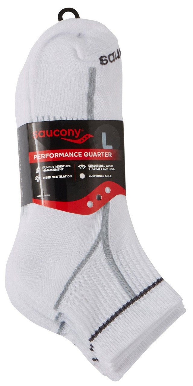 Performance Cushioned Quarter Socks by Saucony feature RunDry moisture management, arch support, mesh ventilation, and a cushioned sole. Package includes six pairs of socks. Fabrication is 97% polyester, 3% spandex.
