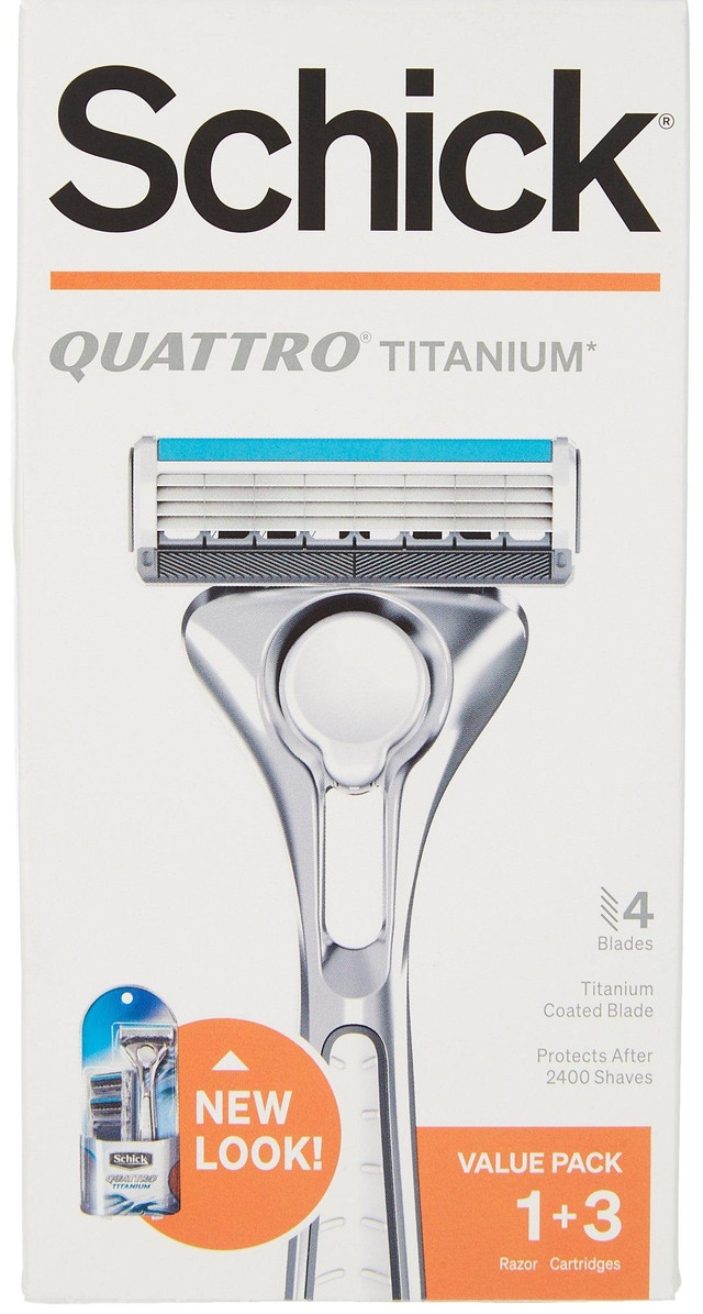 This Quattro Value Pack contains one refillable razor and 3 cartridges with 4 titanium-coated blades each. Features an ergonomic handle for a dependable, close, and comfortable shave.