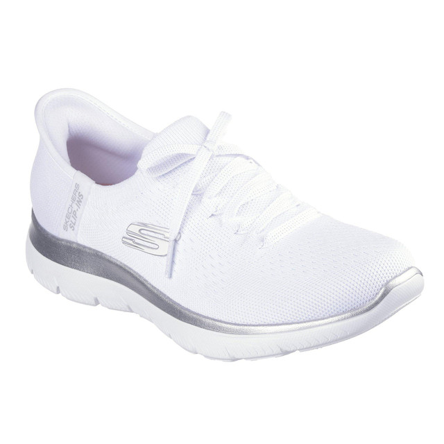 Pick up the pace with increased ease-of-wear and platinum comfort wearing Skechers Hands Free Slip-ins: Summits - Night Chic. Designed with our exclusive Heel Pillow, this vegan style features a Stretch Fit engineered knit upper with fixed laces, metallic midsole trim and a cushioned Skechers Air-Cooled Memory Foam comfort insole.