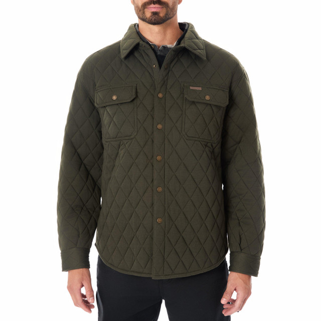 Look great in comfort in our diamond quilted knit shirt-Jac. This easy to toss-on shirt-jacket features snap closures for easy on and off, 2 chest pockets, side seam pockets and adjustable cuffs.
