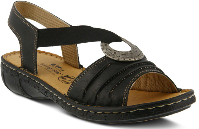 Karmel is a European inspired leather sandal featuring genuine leather, stitched upper construction, elastic starps, and antiqued finished metal ornament, and cork-inspired textured wedge. Soft textile lining and padded foot bed add to this shoe's appeal. Made in Turkey.
