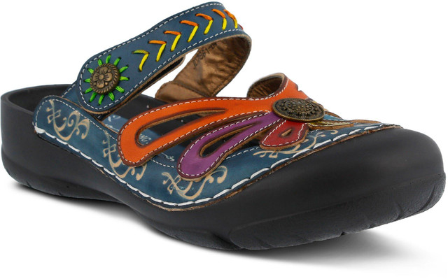 This beautifully hand-painted and embossed nature inspired design has a hook & loop strap embellished with metal ornaments that offer a secure and comfortable fit. The padded footbed, and naturally shock absorbent and supportive for your back & knees. Platform height is .75''.