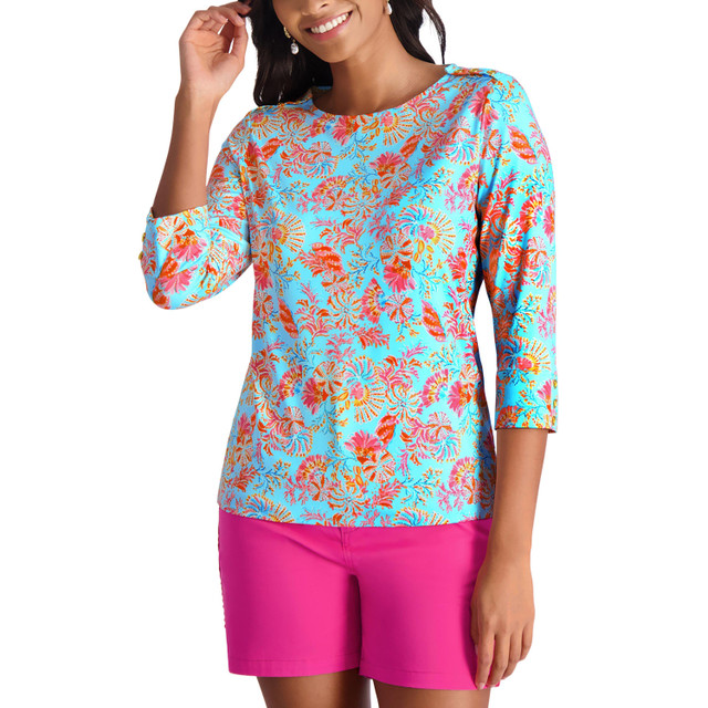 Stella Parker offers timeless fashion that meets comfort, with feminine and playful dresses, swimwear and layers. Explore Stella Parker's whimsical prints and vibrant colors that will put you in a vacation state of mind, inspiring confidence and relaxation. Look your best with our beautiful assortment.This 3/4 sleevetop features gold button detail on the shoulders. Available in stripes, tropical, and floral print.