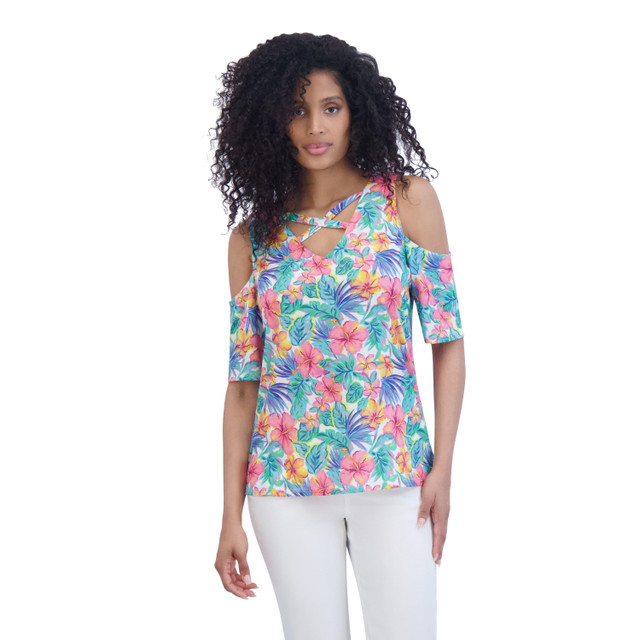 Stella Parker offers timeless fashion that meets comfort, with feminine and playful dresses, swimwear and layers. Explore Stella Parker's whimsical prints and vibrant colors that will put you in a vacation state of mind, inspiring confidence and relaxation. Look your best with our beautiful assortment.The criss cross colder shoulder top is soft and lightweight, available in tropical and floral prints.