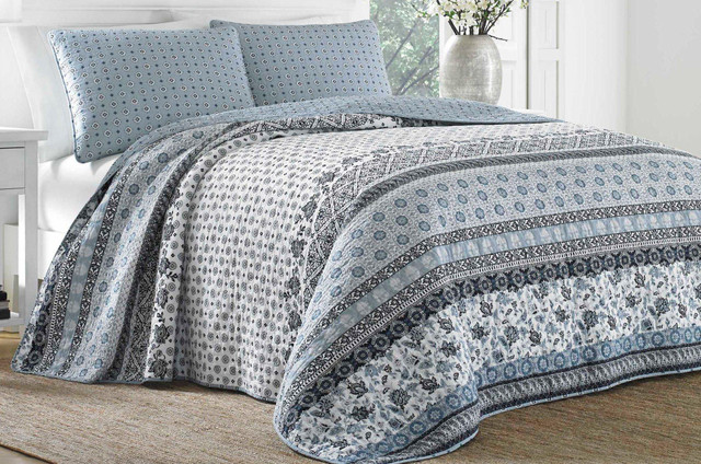 The Stone Cottage Bexley quilt set features an eclectic mix of provincial block prints arranged in a patchwork stripe layout. The washed cotton quilt reverses to a small-scale medallion foulard print. Set includes quilt and 2 pillow shams (1 twin).
