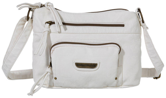 This bag features a solid color design with an all-over embossed detail, a front zipper pouch pocket, both front and rear zipper pockets, an adjustable crossbody strap, top double zip closures and two lined main compartments with pockets. Bag measures approximately 11 in. L x 4 in. W x 8 in. H.