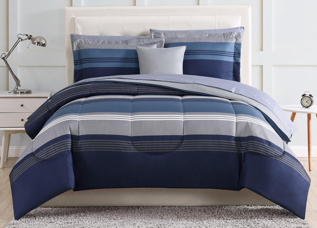 This repeating block print dominates the face of the comforter allows you to mix and match with a bonus set of sheets. Each ensemble comes with all you need to complete the bed and a decorative pillow to finish it off.