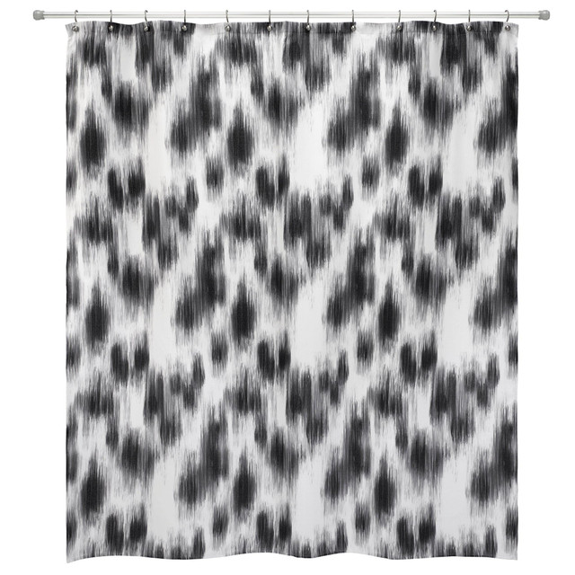 The Nicole Miller Sydney Shower Curtain is decorated with an updated take on the classic spotted black and white animal print. Printed on a 100% polyester cloth for easy care. Liner not included. Shop the entire Sydney Bath Collection by Nicole Miller. Shower Curtain dimensions: 72 x 72.
