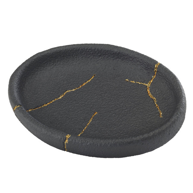 The Nicole Miller Sydney Soap Dish features a matte black textured body decorated with gold veins running throughout. Made of durable resin for easy care and long life. Perfect update for a contemporary bathroom. Coordinating shower curtain, rug, towel and other accessory pieces available. Shop the entire Sydney Bath Collection by Nicole Miller. Soap Dish dimensions: 5.55 x 4.3 x .79.