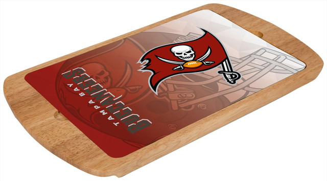 Billboard Glass Top Serving Tray is a rubberwood cutting board with a removable and customizable glass plate top that features Tampa Bay Buccaneers. Glass is tempered and measures: 14 x 9.875 x .2 inches. Rubberwood base measures 17.5 x 9.75 x 7.55 inches.