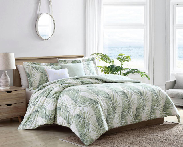 Tommy Bahama Kauai 5 piece comforter bonus set features a green palm leaf pattern on an ivory ground. The reverse is solid light green.The square breakfast pillow matches the comforter reverse, while the oblong breakfast pillow says 'relax' with natural colored embroidery and cording. The included comforter is 100% cotton with an 8 oz. Set includes 1 comforter, 2 standard shams & 2 decorative pillows.