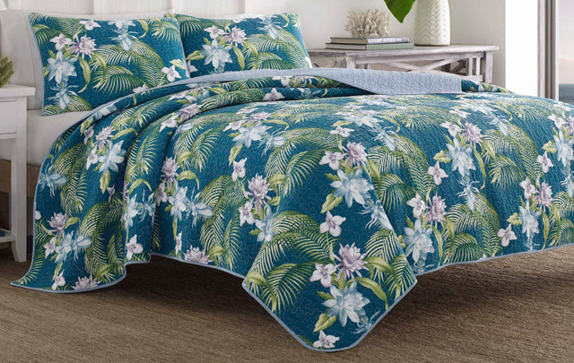 Southern Breeze Quilt Set by Tommy Bahama features a bold leaf design with exotic flowers in tones of pale plum and chambray blue. Quilt reverses to a weave texture print in chambray blue that also trims the edges of quilt and shams. Quilt set includes quilt and 2 shams (1 twin).