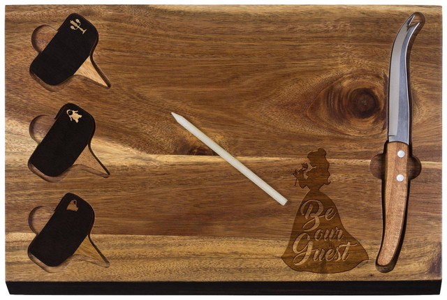 Cutting board and cheese tools set includes cutting board, one cheese knife, three cheese markers, and one soapstone pencil. Set features decoration of Beauty and the Beast and cutouts to fit knife & cheese markers. Measures: 15 '' x 10 x .8.