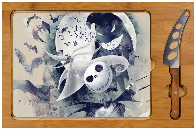 The Icon Jack and Zero Cutting Board is a 3-pc. set that has a solid rubberwood base with a bamboo rim accent, a tempered glass cheese/cutting board, & a cheese knife with its own carved out area in the wood base. Measures 15.2''L x 10''W x .8''H.