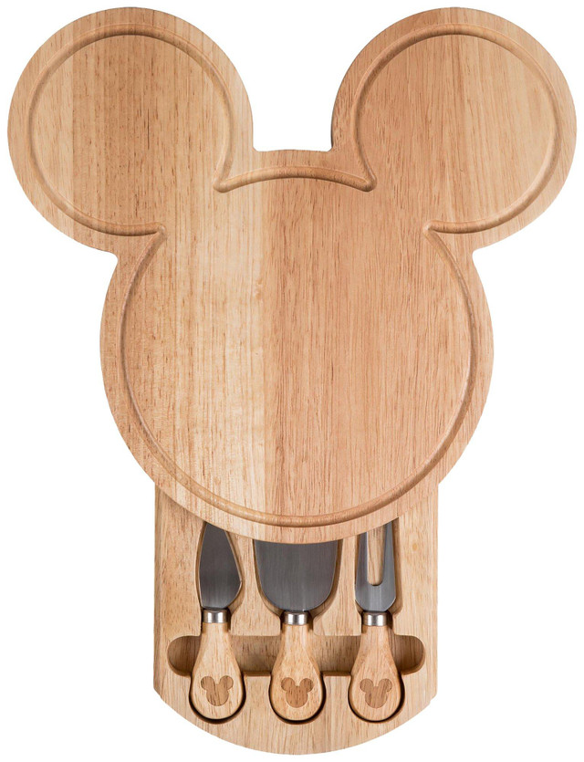 Mickey Mouse silhouette-shaped cheese board with three wood and stainless-steel cheese tools in pull-out drawer. Tools include hard cheese chisel-type knife, cheese shaver, and pointed-tip cheese knife spreader. Made of rubberwood. 12.6 x 11.8 x 1.5.