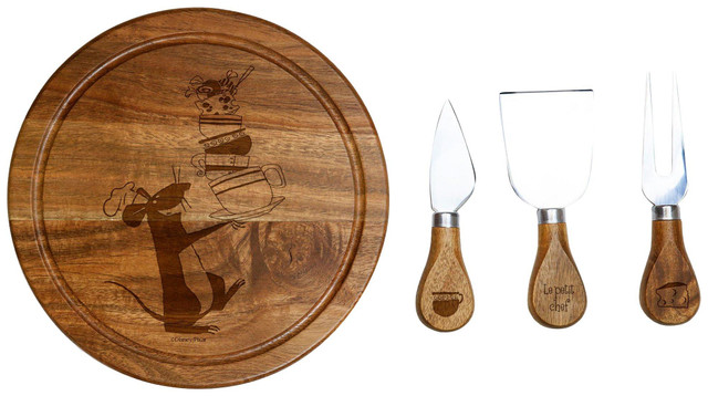 Circular cheese/cutting board comes with 3 stainless steel tools with wood handles (cheese knife, chisel knife, and cheese fork). Made of Acacia wood and measures 7.5 diameter x 1.2. Decoration features Ratatouille design.
