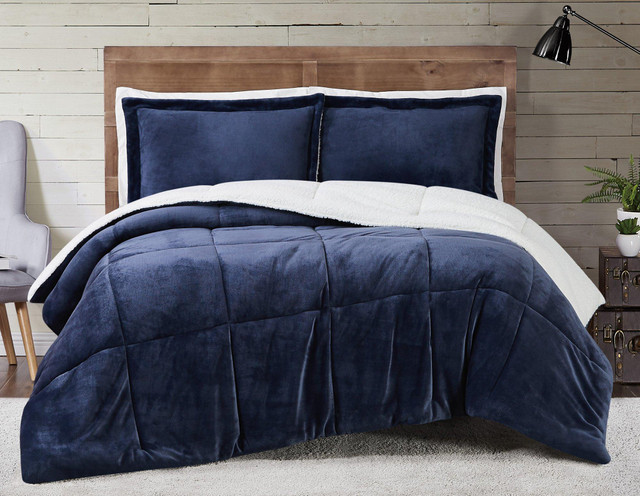 Solid color velvet face cloth reverses to a luxurious sherpa plush fabric in designer soldi colors. The fabric provides the ultimate in softness and is great for cold nights. The polyester velvet face cloth is durabel and able to handle high traffic areas. Set features one comforter and two pillow shams (one for twin).