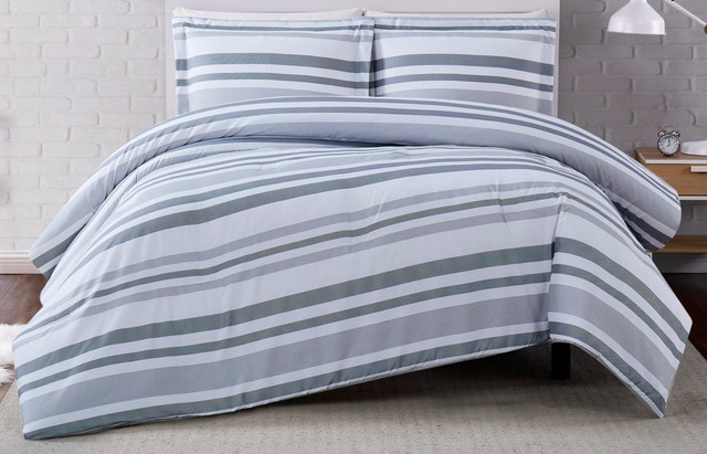 Gray and white printed horizontal stripe on a white base is perfect for a modern and casual room. The fabric is 100% brushed microfiber. Set includes duvet cover & 2 pillow shams (1 twin).