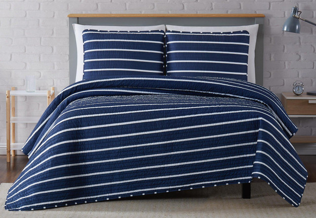 This easy to coordinate large scale window pane print is a great coordinate to a modern room or a simple coordinate to finish a bedroom. The cloth uses a white textured double line plaid print on a solid color base cloth. The base cloth is a 100% microfiber polyester. The set is completed with coordinating shams (one Sham for Twin).