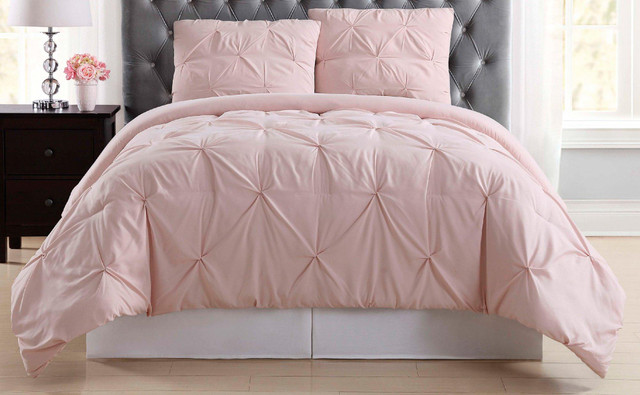Pleated face on the comforter and shams with a solid color reverse. The face cloth is 100% microfiber polyester with a pleated finish to provide texture for your bed.Revolutionary softness is what you get with this every day collection. Comforter and sham face and back cloth is 100% brushed microfiber polyester with polyester filling.