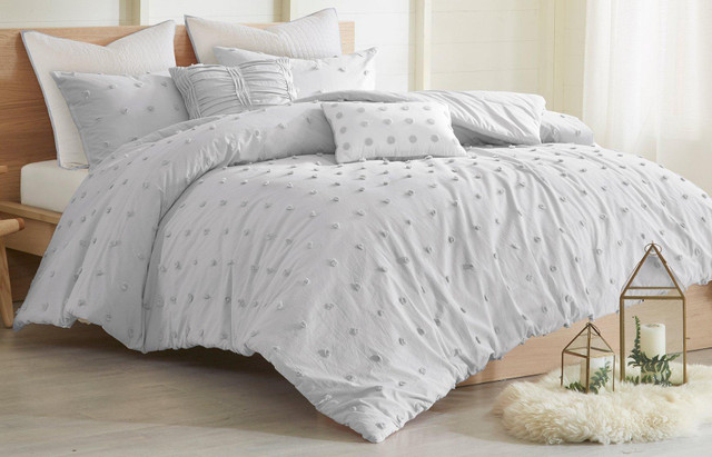 The Urban Habitat Brooklyn Cotton Jacquard Comforter Set brings a soft and charming update to your bedroom. The navy cotton comforter features small tufted chenille dots that create a fresh shabby chic look. Matching shams (1 in Twin/TwinXL) and quilted Euro shams (1 in Twin/TwinXL) complement the cotton jacquard comforter set. Two decorative pillows are also included, adding the finishing touches. This bedding set is also OEKO-TEX certified.