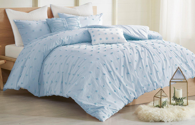 Urban Habitat Bedding Set features a solid color with small cotton tufts. Set includes duvet cover, two pillow shams (one for twin/twin xl), two euro pillow shams (one for twin/twin xl), and two decorative pillow. Decorative pillows measure 18'' x 18'' and 18'' x 12''.