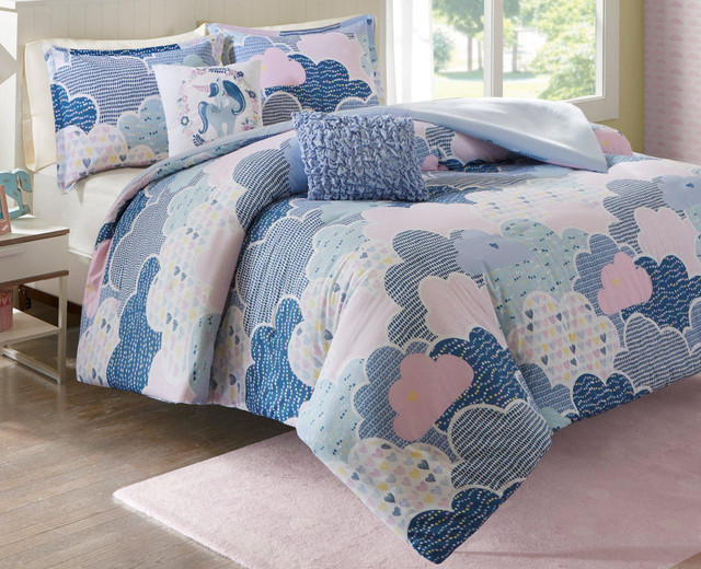 Nestle in clouds with the Urban Habitat Kids Cloud 4 Piece Duvet Cover Set. The duvet cover showcases various cute and fluffy clouds in a colorful palette. Within each cloud is a playful design that adds extra charm and dimension. The duvet cover reverses to a solid coordinating color. Pillow features all-over ruching and the other features an embroidered unicorn. Set includes duvet cover, 2 shams (1twin) & 2 decorative pillows. Pillows measure: 12'' x 16'' and 16'' x 16''.