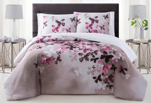 A beautiful butterfly bouquet is engineered on this striking pattern. Shades of purple, white, gray and black dominate the bed as a marbled back print explodes with colorful butterflies. The 100% cotton, 200 thread count sateen woven face cloth is soft and clean to the touch. The 100% cotton reverse fabric makes sure you are only touching natural fibers as you sleep. Set includes comforter and 2 pillow shams (1 twin).