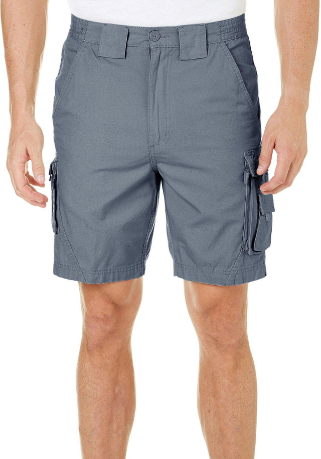 Weekender provides sophisticated, practical casual sportswear. These cargo shorts feature a solid color design, a back elastic waistband, two side seam pockets, two cargo pockets, one back pocket, and a coin pocket. The inseam measures approximately 9 in.