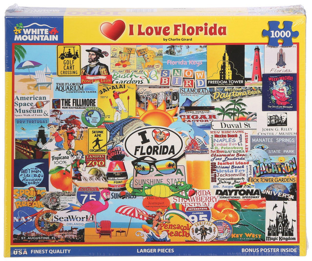 For over 30 years, White Mountain Puzzles has crafted the highest quality puzzles for the entire family to enjoy. This Workman Publishing 1,000-Piece Puzzle features a lot of color and detail to challenge the most competitive puzzlers in your family.For over 30 years, White Mountain Puzzles has crafted the highest quality puzzles for the entire family to enjoy. This Workmaroughout the state of Florida. 30 x 24 inches. Ages 12+.