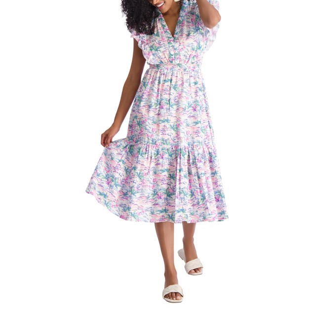 The Fiona Flutter Sleeve Smocked Waist Midi Dress features a V-Neck elastic placket down center front with a double ruffle at front and back. The Smocked elastic at waist, shirring at the top and bottom of the waist and hem ruffle with shirring provide a sweet silhoutte. 47 body length from HPS on a size Medium.