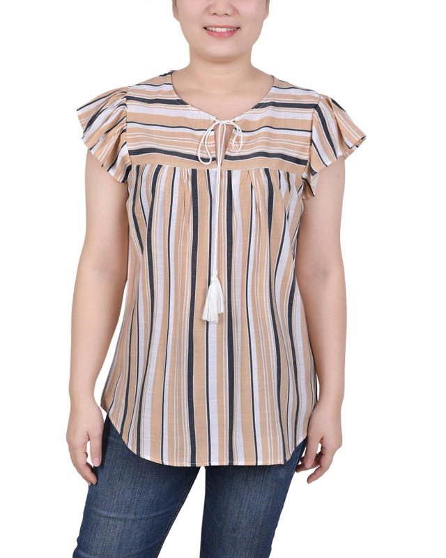 Womens Petite Flutter Sleeve Vertical Striped Blouse