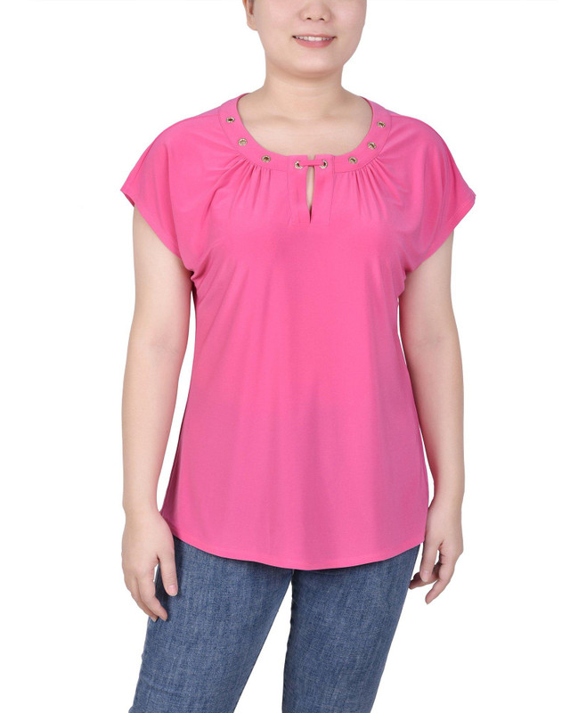 Womens Petite Short Extended-Sleeve Grommet Neck Knit Top