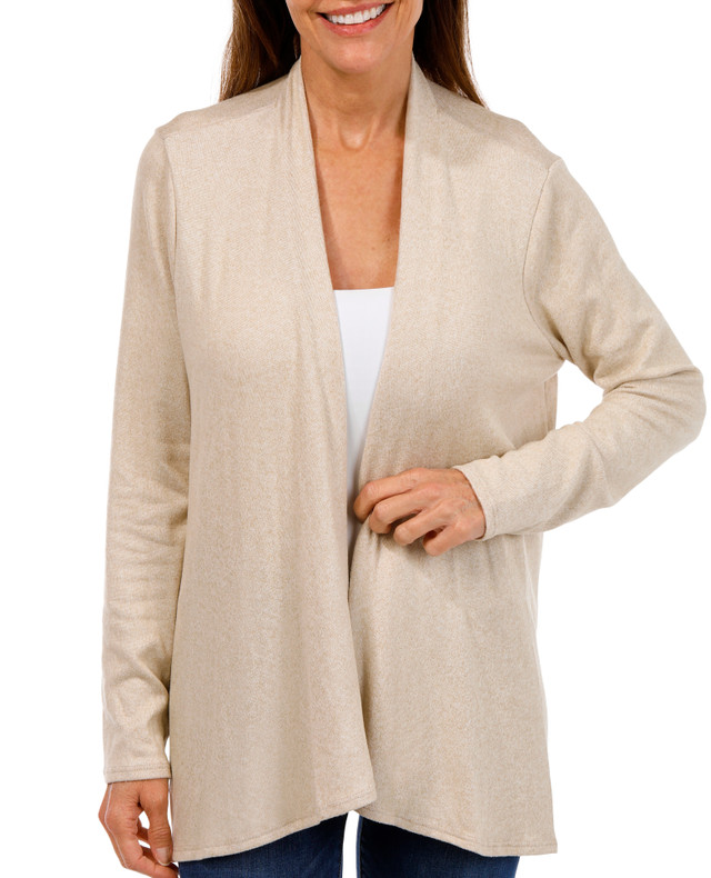 This 3/4 sleeve cardigan features a solid color design on soft lightweight knit fabric, and open relaxed styling. The top length measures approximately 25 in. Fabrication 95% polyester, 5% spandex.