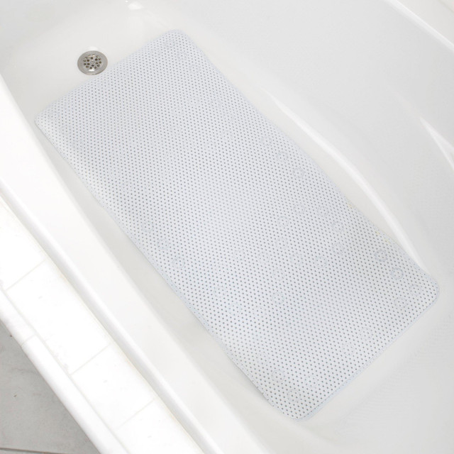 This tub mat features a solid color design on a cushioned waffle texture, skid resistant suction cups, and is treated with an agent to resist mildew. Tub mat measures 36in. L x 17in. W.