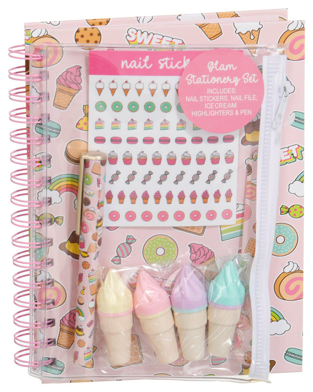 Keep your thoughts and essentials in one stylish place with the Sweets Themed Journal Set! Designed for convenience and creativity, this set features a hardcover journal, a sleek pen, and a zipper case holder to store small must-haves. This set includes Nail Stickers, Nail File, Icecream Highlighters, and a Pen