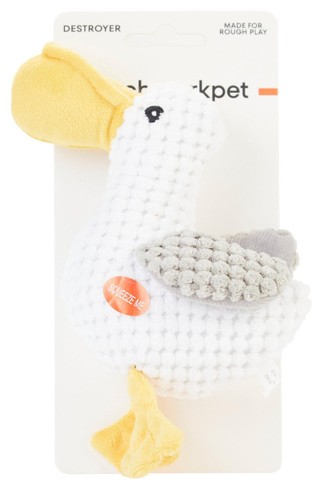 Add coastal character to your pets toy collection with the 7 in Seagull Dog Toy designed for rough play and built with a durable construction to withstand active chewing. Features a built in squeaker for added engagement and fun. Soft construction makes it ideal for cuddling or light activity. Fabrication is 100% polyester. Measures approximately 7 in x 6 in x 2 in.