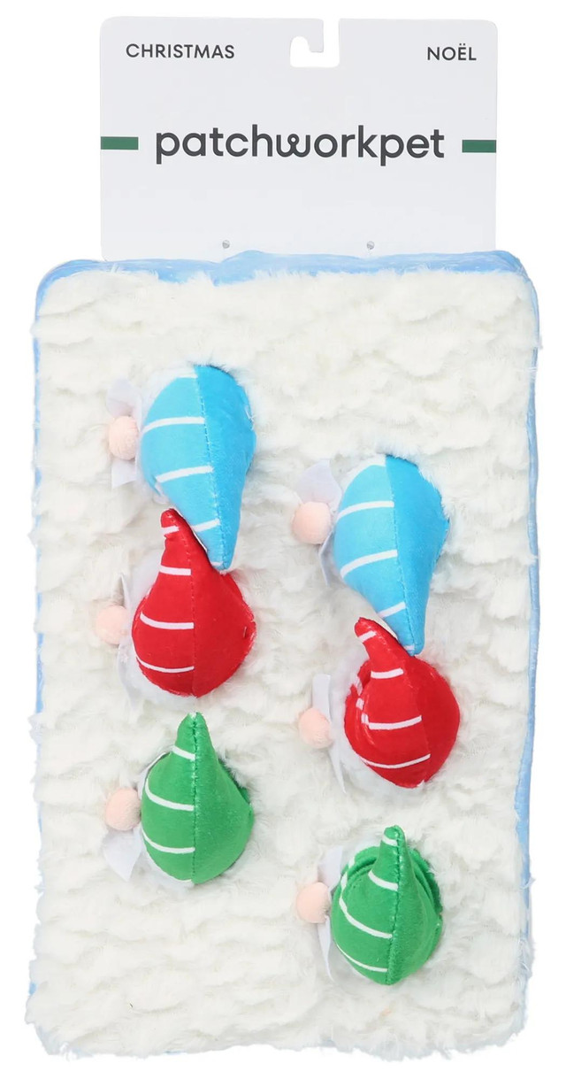 This festive Christmas dog toy features playful snow gnomes with squeakers that can be pulled out. Perfect for interactive play, it keeps dogs entertained while adding a cheerful holiday touch to their toys. Toy measures approximately 13 in x 8 in.